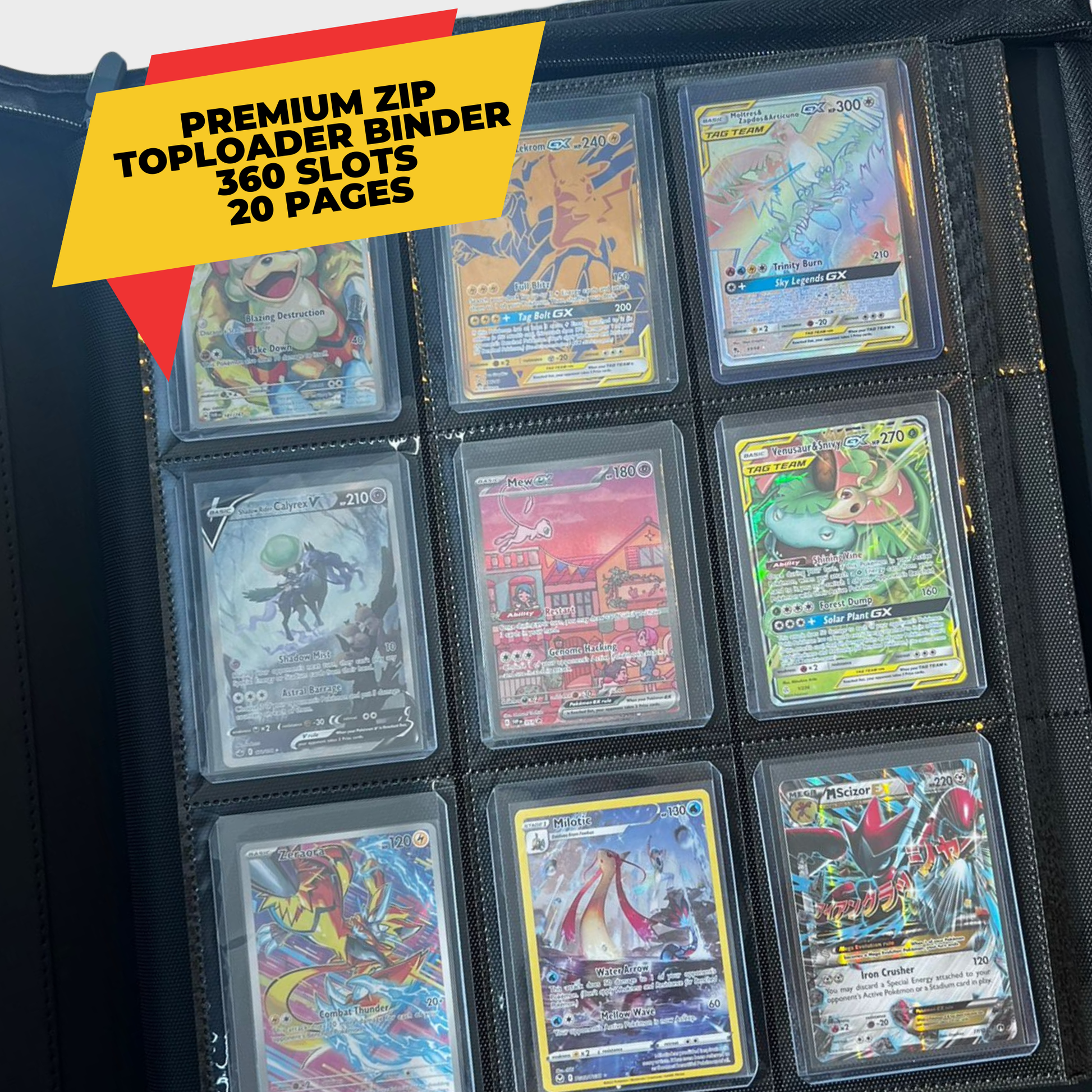 Sleek black design, this zippered 9-pocket top loader binder is side-loading for easy insertion and can hold up to a total of 360 cards.